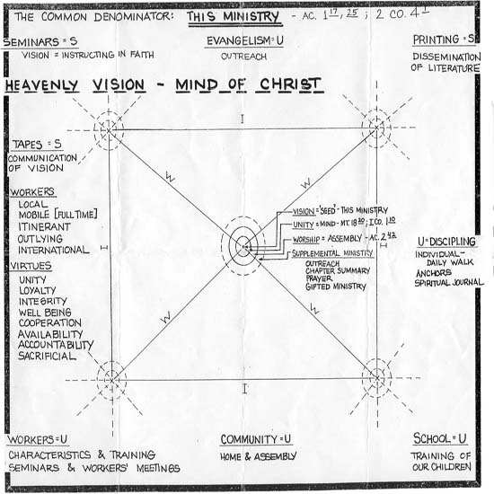 As is mentioned elsewhere on this website, George believes he is like the apostle Paul and that his ministry is apostolic -- Fullerton is like Jerusalem (or maybe, he thinks of it as Antioch), and the proceeding Assemblies are places like Colosse, and then Laodicea and Hierapolis (Col 4:13) in that the "seed" went in, germinated, and produced other Assemblies. The vision is being "sounded out" to the SF Valley, Spokane, and the far reaches of Nebraska (I Thes 1:8).