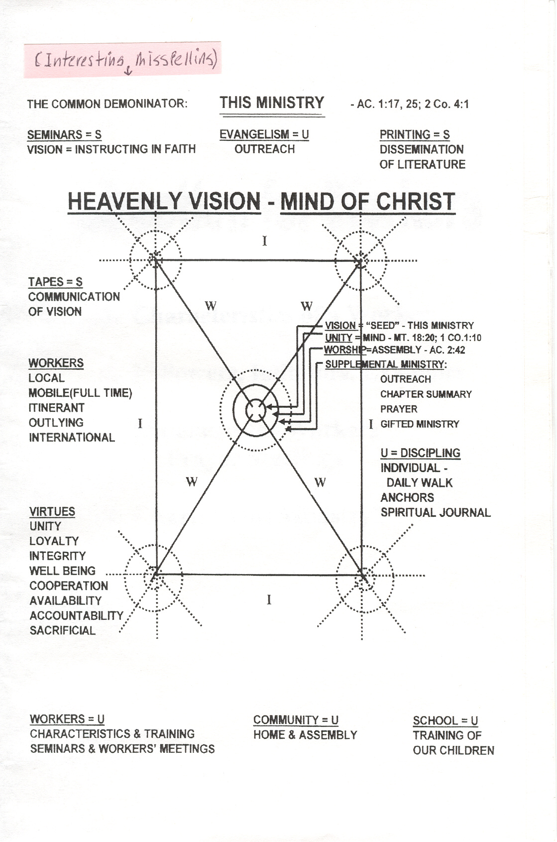 The "seed" that was originally in the center is missing in this version of the chart. The absence makes it more noticeable that the center, the inmost core, is not Christ, nor the Word of God, but George's "Vision." The second layer is "Unity" around that vision. The third layer is the Assembly, which gathers around the center, the Vision. A student in the Fullerton classes on this chart has written his observations.
